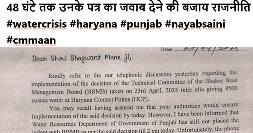CM श्री @NayabSainiBJP को 48 घंटे तक उनके पत्र का जवाब देने की बजाय राजनीति #watercrisis #haryana #punjab #nayabsaini #cmmaan पंजाब CM श्री भगवंत मान के जल वितरण बयान को आश्चर्यजनक बताया। कहा—26 अप्रैल को उन्होंने खुद श्री मान को फोन कर बताया कि BBMB की टेक्निकल कमेटी ने पंजाब, हरियाणा, दिल्ली व राजस्थान को पानी छोड़ने का जो फैसला लिया था,उस पर पंजाब के अधिकारी अमल नहीं कर रहे।