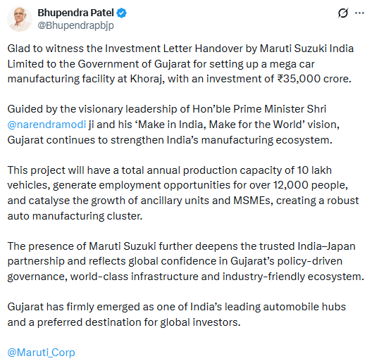 Bhupendra Patel गुजरात बनेगा ग्लोबल ऑटो हब! मारुति सुजुकी निवेश करेगी ₹35,000 करोड़, खोरज में लगेगा विशाल प्लांट