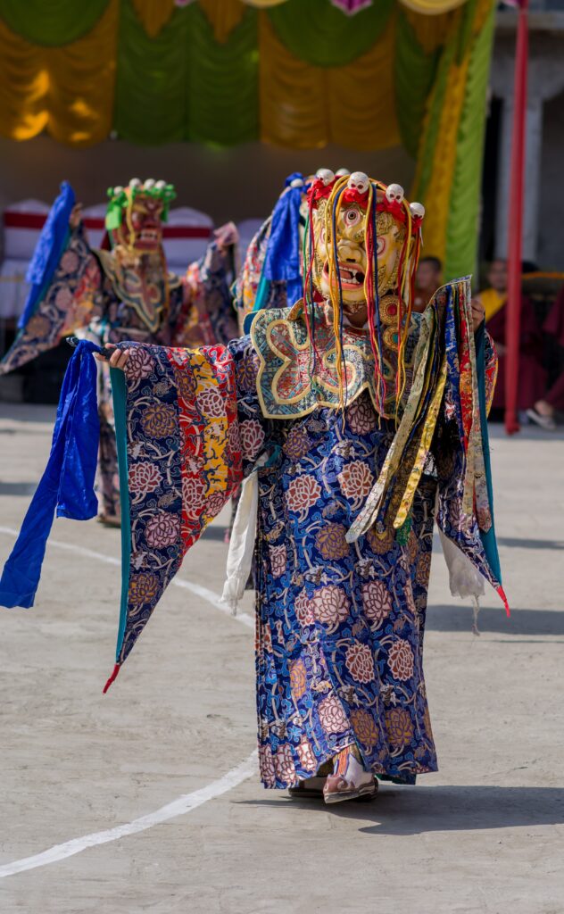 • चाम नृत्य (Mask Dance): इस उत्सव की सबसे बड़ी पहचान ‘चाम’ नृत्य है। भिक्षु और आम लोग चमकीले रेशमी कपड़े पहनकर और लकड़ी के भारी मुखौटे लगाकर नृत्य करते हैं। ये मुखौटे देवी-देवताओं, जानवरों और राक्षसों के होते हैं, जो बुराई पर अच्छाई की जीत की कहानियाँ सुनाते हैं।