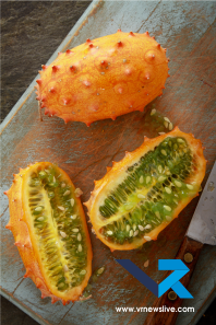 यह फल किसी साइंस फिक्शन फिल्म का हिस्सा लगता है। इसका बाहरी हिस्सा नारंगी होता है जिस पर छोटे-छोटे सींग होते हैं। अंदर से यह हरे रंग की जेली जैसा होता है। इसका स्वाद खीरे, कीवी और केले के मिश्रण जैसा होता है। यह अफ्रीका में मुख्य रूप से पाया जाता है। किवानो (Kiwano / Horned Melon) मुख्य रूप से अफ्रीका के मध्य और दक्षिणी क्षेत्रों, विशेषकर कालाहारी रेगिस्तान, का एक मूल फल है, जिसे ‘अफ्रीकी हॉर्न्ड कुकुम्बर’ या ‘सींग वाला खरबूजा’ भी कहते हैं, और यह अपने कांटेदार नारंगी छिलके और हरे, जिलेटिन जैसे गूदे के लिए जाना जाता है