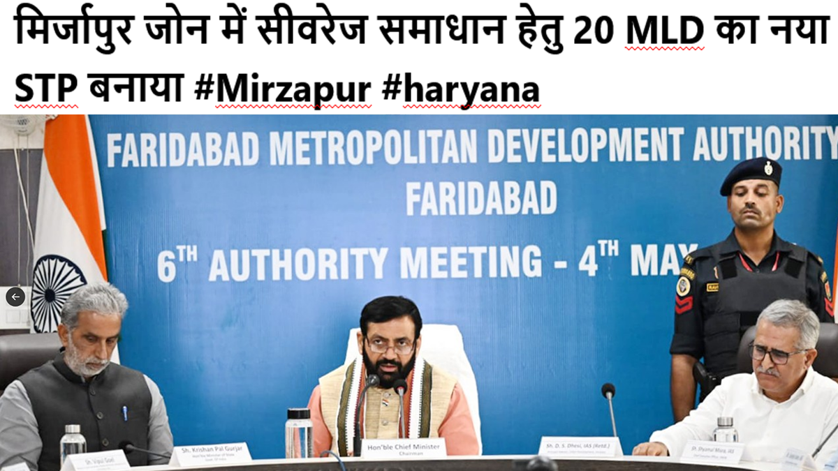 सीवरेज समाधान हेतु 20 MLD का नया STP बनाया – फरीदाबाद में एफएमडीए की छठी बैठक की अध्यक्षता करते हुए मुख्यमंत्री श्री @NayabSainiBJP ने कहा कि फरीदाबाद में जलापूर्ति बढ़ाने पर विशेष ध्यान दिया जाएगा। उन्होंने निर्देश दिए कि सभी बुनियादी ढांचे समय पर पूरे हों व मिर्जापुर जोन में सीवरेज समाधान हेतु 20 MLD का नया STP बनाया जाए।