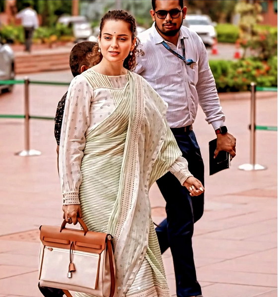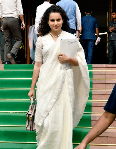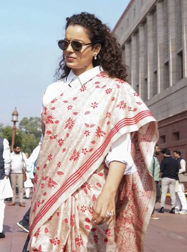 कंगना रनौत हमेशा भारतीयता में रची-बसी स्टाइलिंग को अपने तरीके से पेश करती हैं, और संसद में उनका यह लुक भी कुछ ऐसा ही था। उन्होंने भारी फैब्रिक की साड़ी को एक क्लासी वूलन शॉल के साथ कैरी किया—जो दिखने में रॉयल और पहनने में बेहद प्रैक्टिकल है।