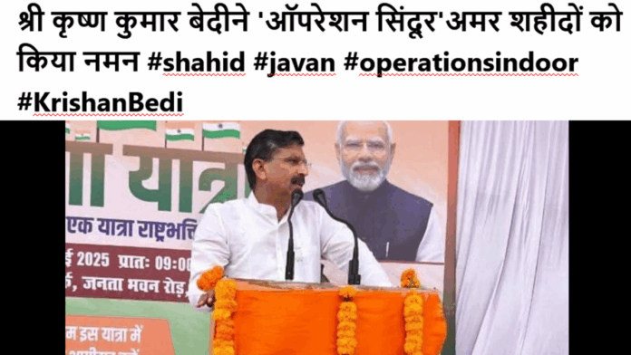 ‘ऑपरेशन सिंदूर’अमर शहीदों #shahid #javan #operationsindoor #KrishanBedi – कैबिनेट मंत्री श्री कृष्ण कुमार बेदी ने ‘ऑपरेशन सिंदूर’ की कामयाबी पर बोलते हुए कहा कि देश की पूरी सैन्य शक्ति और उसके शौर्य को हम सलाम करते हैं और आतंकवाद पर कड़ा प्रहार करने वाले अमर शहीदों को नमन करते हैं।