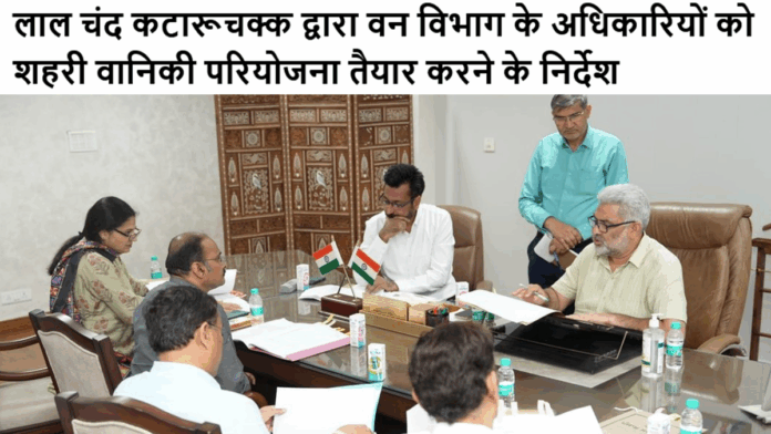 वन एवं वन्यजीव सुरक्षा मंत्री श्री लाल चंद कटारूचक्क ने आज एक अनूठी पहल शुरू करते हुए विभाग के अधिकारियों को एक शहरी वानिकी परियोजना तैयार करने के निर्देश दिए जिसके तहत शहरी क्षेत्रों में लंबे पौधे लगाए जाएंगे। इन पौधों की सुरक्षा के लिए इनके चारों ओर ट्री गार्ड लगाए जाएंगे जिन पर विभाग का नाम लिखा होगा।