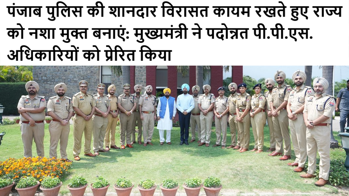 पंजाब के मुख्यमंत्री भगवंत सिंह मान ने आज पंजाब पुलिस सर्विसेज (पी.पी.एस) के पदोन्नत अधिकारियों को राज्य को नशे की बुराई से मुक्त कर पंजाब पुलिस की शानदार विरासत को बरकरार रखने के लिए प्रेरित किया।